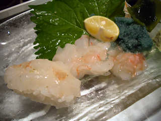 とりあえず冷酒を飲みながら,何から行こうかと考えていると,いきなりサービスですと突き出しが出て来た(上の写真左)。この店,毎回帰るときにサービス券をくれて,刺身盛り合わせなどが無料でいただけるのだが,小食の私としては,余分なものを食べると大好きな寿司がたくさん食べれないので,サービス券を出さなかった。が,好意で出てきたものは有難くいただく。ヒラメの刺身に,鱧(はも)の梅肉,イカのヌタ。なかなかにいける。やっぱり刺身は寿司屋だなぁ。